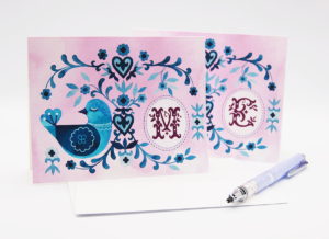 Monogrammed stationery feature hand-lettered initials on greeting cards, notepads, and more!