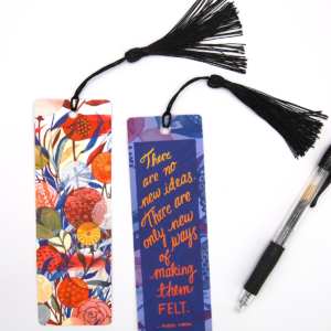 I design my bookmarks with original illustrations and hand-lettered quotes.